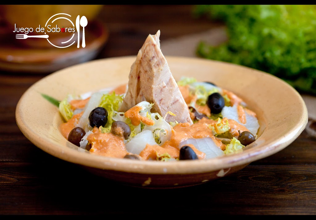 Poner en una fuente o plato la escarola lavada y escurrida; el bacalao crudo, cortado a trozos; las aceitunas; las anchoas cortadas en trocitos y el atún.