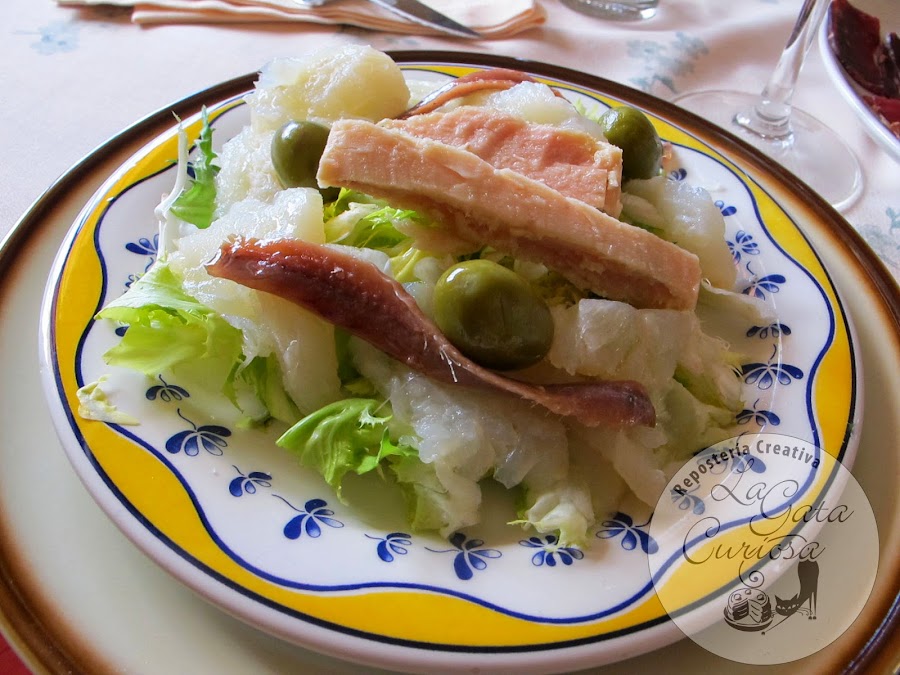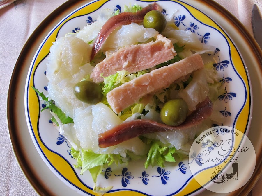 Para preparar la ensalada lavamos bien la escarola, la troceamos y la repartimos en los platos, salamos un poco, repartimos por encima el bacalao, el atún las anchos y las olivas añadimos un poco de sala y ya tendremos lista nuestra ensalada.
