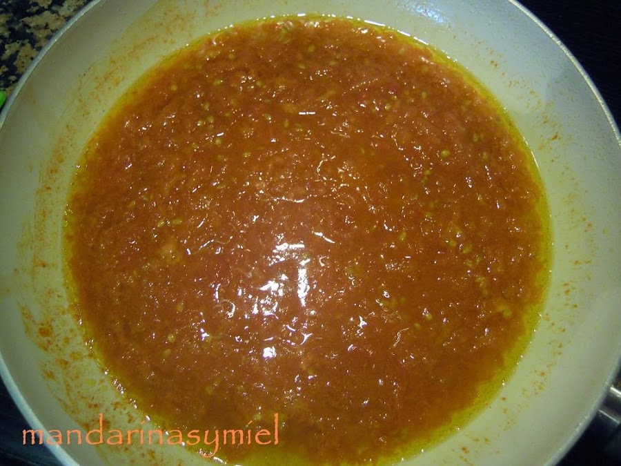 Pon en una sartén el aceite a calentar, echa el tomate rallado o el triturado y deja que se fría bien, añade la cucharadita de azúcar, remueve.
