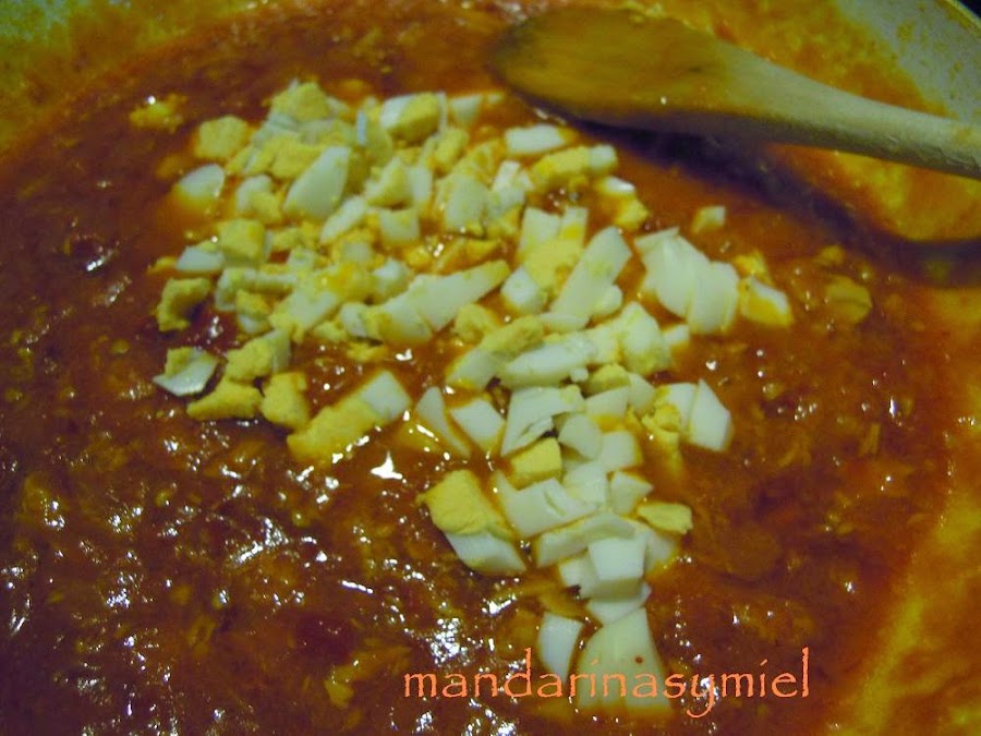 Cuando esté frito, pon el atún, el pimiento cortado fino y los huevos picados, mezcla y al final, pon los piñones. Deja que se enfríe.
