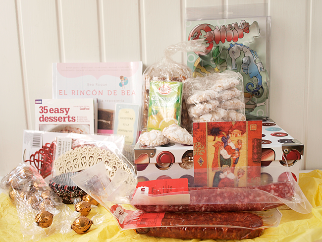 No paraban de salir regalos: el libro de Bea Roque, de El Rincón de Bea; un libro de recetas inglesas sencillas; dos packs de wraps para cupcakes; cápsulas pirata; aroma de limón; unos cortadores del fondo del mar; un macapáginas chulísimo (me colecciono); un montón de recetas "de esas que siempre salen bien"; un chorizo y ¿un salchichón?; bombones riquísimos; turrón; y unas pastas de almendra que están... ¡BUENÍSIMAS! ¡Ah! Y una carta y una postal de su puño y letra. ¡Qué guay! ¡Gracias Pilar! (¡Creo que no me dejo nada!).