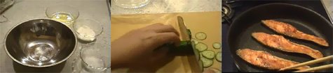 5. Ponemos sobre la plancha (o sartén) a fuego fuerte el salmón (si hemos dejado la piel, empezaremos por dorarla hasta que veamos que queda crujiente), doramos una cara, bajamos el fuego, damos la vuelta y cubrimos cada pieza con las láminas de pepino maceradas, con el fin de que preserven el calor y nutran la parte tostada con más salsa.
