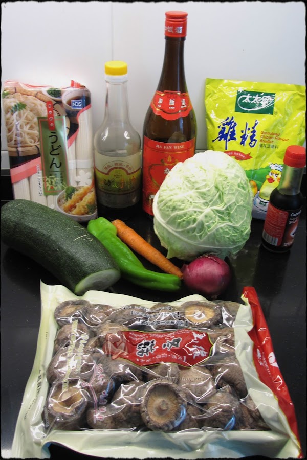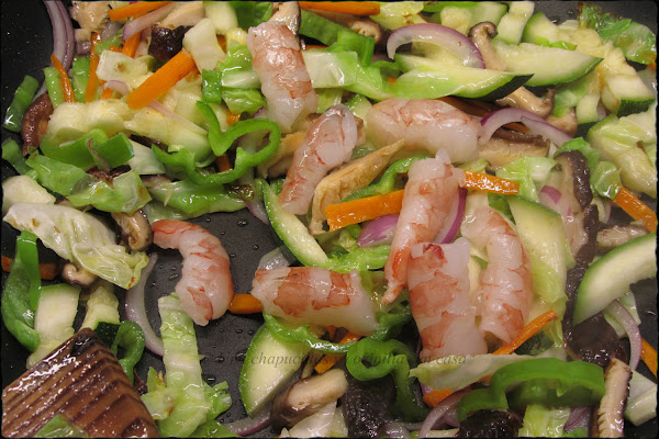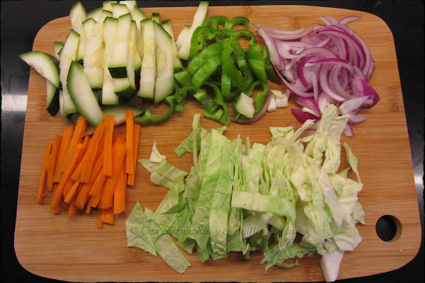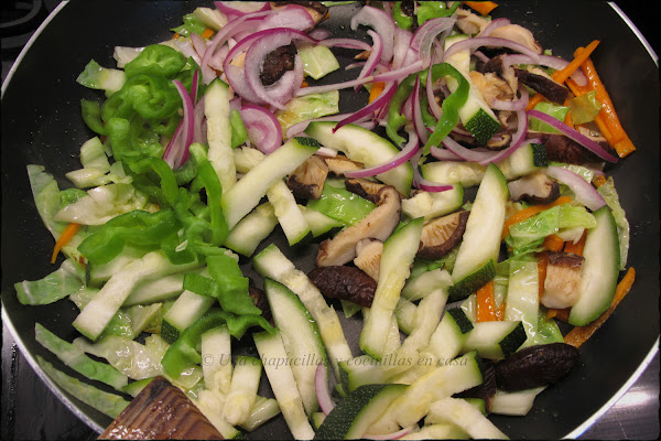 Cortar las cantidad de verduras que deseeis, yo puse un poco de cada una. Calabacin y zanahoria en bastones, pimiento verde en rodajas, cebolla en pluma y tiras de col. Aunque no sale en la foto, tambien corte en dos los langostinos que previamente habia descongelado y las setas hidratadas.