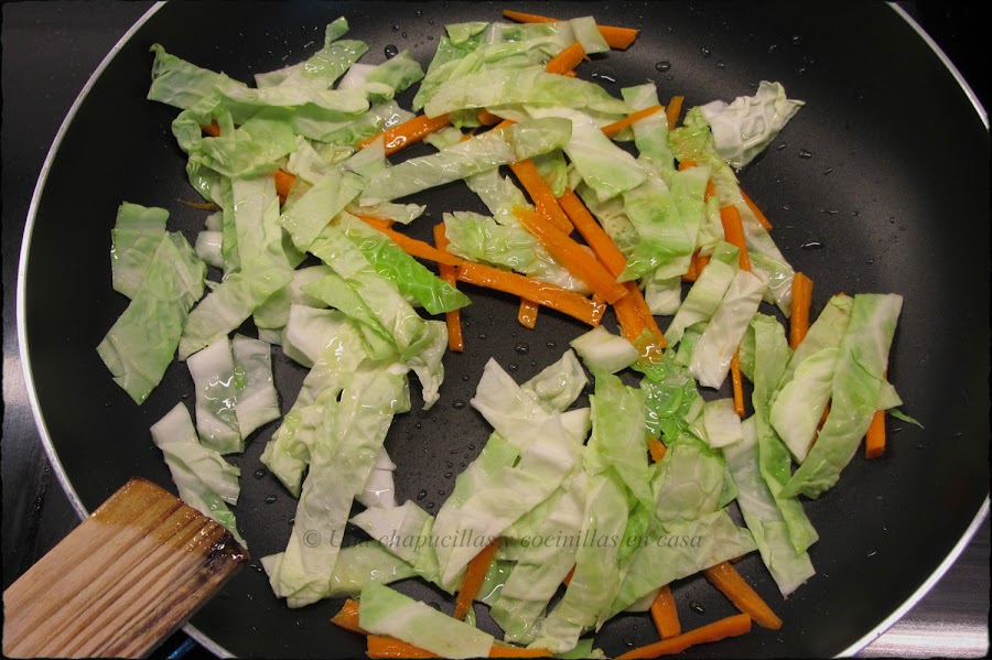 Empezar salteando las zanahorias y la col, incorporar después la cebolla, el pimiento, el calabacin, las setas.