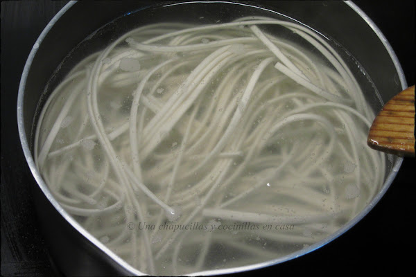 A continuación cocer los fideos udon en abundante agua hirviendo y tenerlos el tiempo que os indique el fabricante en el paquete. Pasado el tiempo, escurrir y reservar.