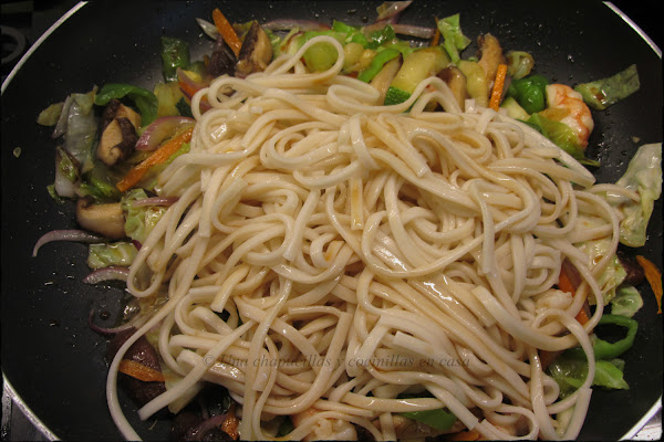 Agregar los udon, un poco de salsa de soja y en mi caso tambien el aderezo de pollo en polvo. Saltear todo 1 o 2 minutos y servir.