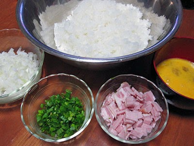 1. Mezclar los huevos con el arroz cocido y añadir la sal.