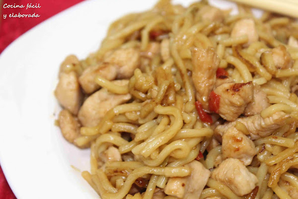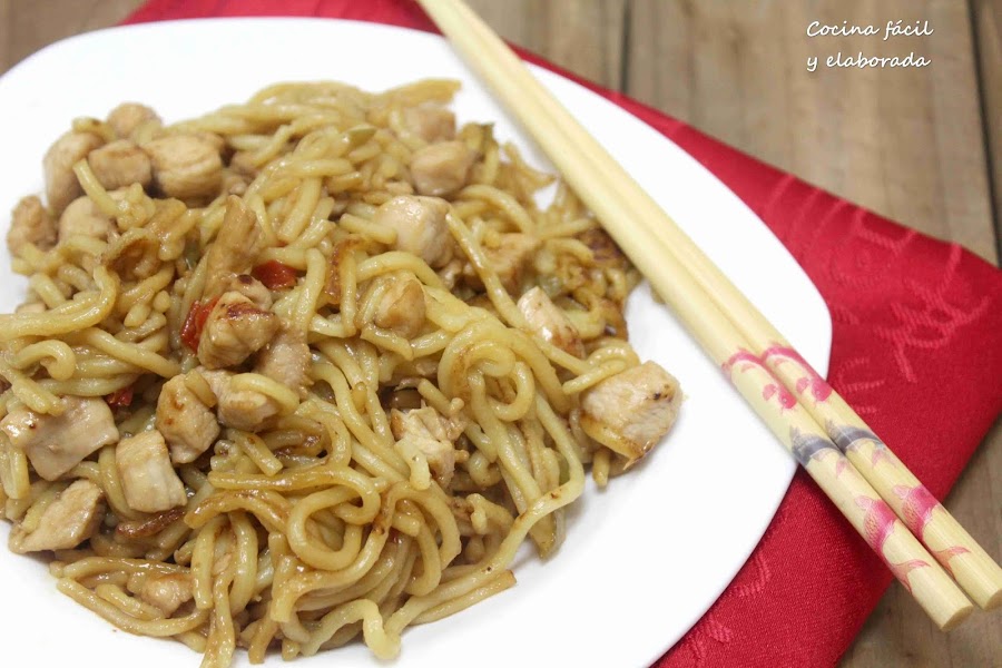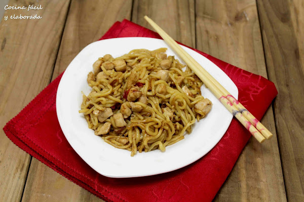 Ya os he comentado en otra entrada que los yakisobas son uno de los platos más famosos de la cocina callejera de Japón. Son originarios de China. Yakisoba quiere decir "tallarines fritos" y se elaboran con los fideos yakisoba y la salsa yakisoba (ambos se pueden conseguir en supermercados asiáticos y en tiendas online). Es una receta muy sencilla de hacer, solo rehogar un poco de verdura, luego la carne (pollo, cerdo o ternera) o langostinos, calamar, solo verduras y por ultimo los fideos y la salsa. Yo he unido el sabor de dos de mis salsas preferidas, porque el pollo lo he macerado en salsa teriyaki.