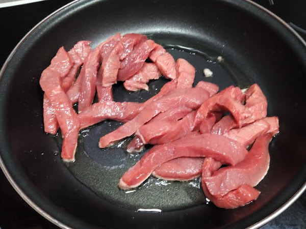 Ponemos una sartén al fuego. Cuando esté caliente añadimos un buen chorrito de aceite y sellamos la ternera salpimentada.