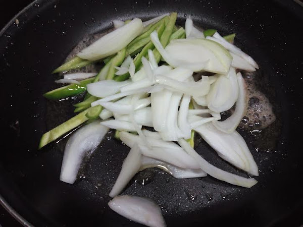 Retiramos de la sartén y en ese mismo aceite sofreímos el pimiento y la cebolla cortados en juliana.
