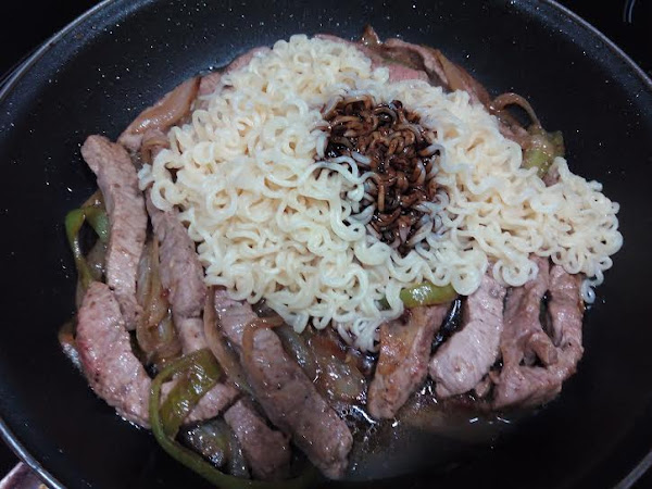 Ponemos un cazo con agua al fuego y cuando rompa a hervir echamos los fideos. Dejamos cocer el tiempo que indique el fabricante. una vez listos incorporamos al sofrito y agregamos el sobrecito con salsa de soja que trae el paquete (el envase lleva dos sobrecitos, uno con salsa de soja y otro con una mezcla de hierbas. Éste último lo he descartado para la receta porque es ahí donde reside el sabor a "sopa de sobre" que no me gusta nada).