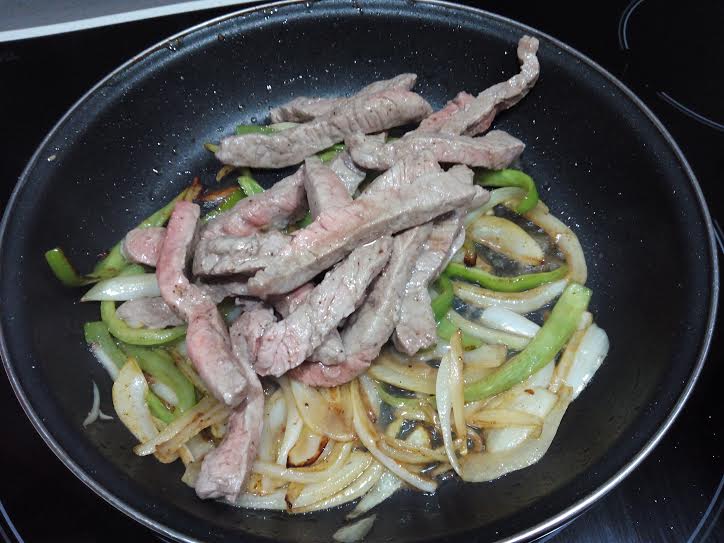 Cuando la verdura esté doradita incorporamos de nuevo la carne y cocinamos un par de minutos todo junto.
