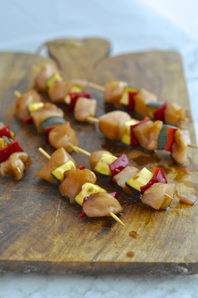 Cortamos la pechuga de pollo en trozos no muy grandes, al igual que el calabacín y el pimiento. Colocamos el pollo en un bol y las verduras en otro y lo cubrimos con la salsa. Dejamos marinar un mínimo de 1 hora.