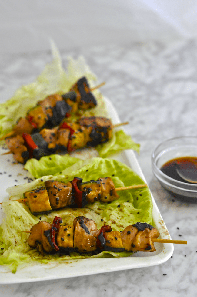 Preparamos las brochetas intercalando el pollo y las verduras. Ponemos a calentar la plancha, la sartén o la barbacoa. si es plancha o sartén y tenemos aceite de sésamo os dará un sabor asiático añadido, si no sin problema un poco de aceite de oliva y hacemos la brocheta por todos los lados.