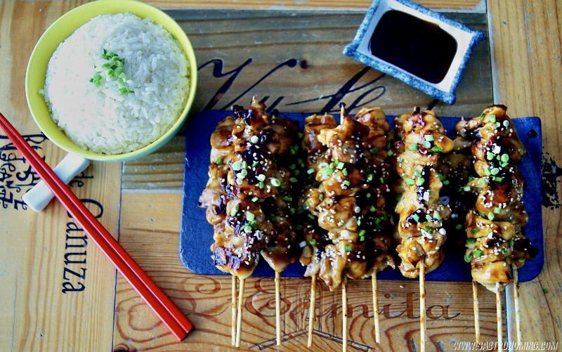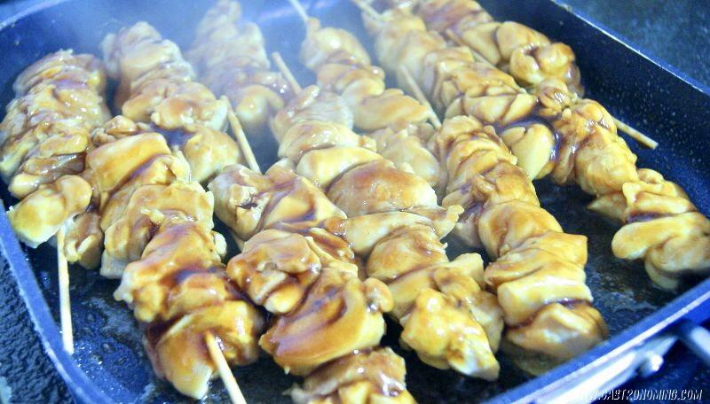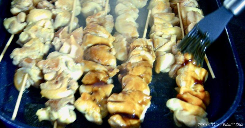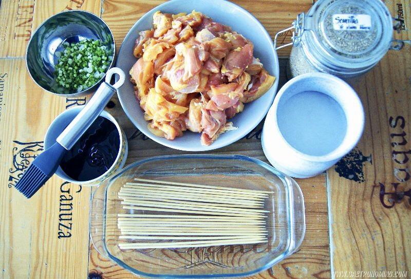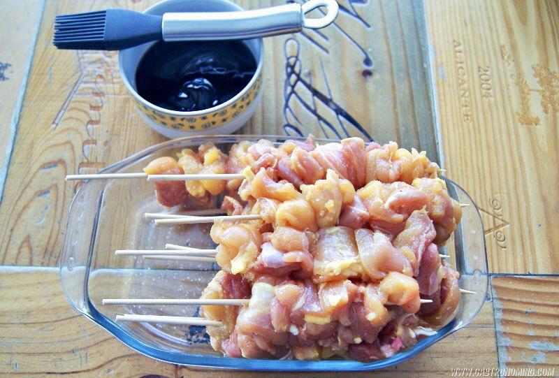 Si tienes el pollo macerado con las salsa y la cocinas, se te caramelizará muy rápido la salsa y el pollo tendrás aspecto de quemado, incluso algo de gusto amargo, por eso te recomiendo que empieces cocinando el pollo sin el marinado previo, como hacen en los restaurantes japoneses y cuando la carne de pollo blanquee, empiezas a pintar las brochetas con la salsa poco a poco hasta que agarren color. Si vas a dejar el pollo marinando con la salsa, más te vale que los trozos sean muy pequeños y en brochetas pequeñas para que se cocinen en un “vuelta y vuelta” de lo contrario, se te quemará la salsa y eso no es nada agradable, garantizado!