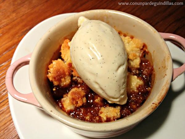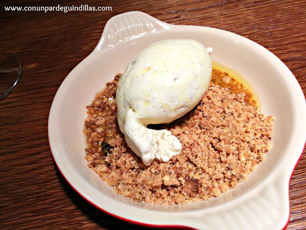 Los platos no salieron con ningún orden, hicimos el pedido a un camarero dejando claro que eran pedidos individuales, que no iban al centro (cosa por otra parte difícil porque está ocupado por una ranura con hielo y cervezas). Nos sirvieron tres camareros diferentes, cuando les dijimos que a todos nos habían servido ya dos brochetas y a una persona le faltaba aún la primera nos dijeron que es que la comida se sirve para compartir y si la queríamos individualizada teníamos que haberlo dicho. Evidentemente respondimos que, efectivamente, previamente habíamos aclarado que íbamos a pedir cada uno lo nuestro y entonces, milagrosamente, aparecieron las dos pedidos faltantes a la vez que los postres. Si la verdadera razón es compartir, ¿tiene algún sentido servir los pimientos de Guernika para acabar la comida. después del espeto y a la altura del postre?, a mi es que el crumble de manzana no me apetece antes de un pimiento frito.