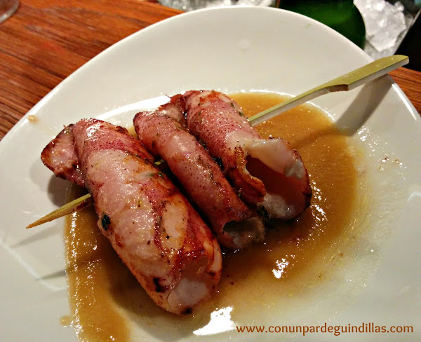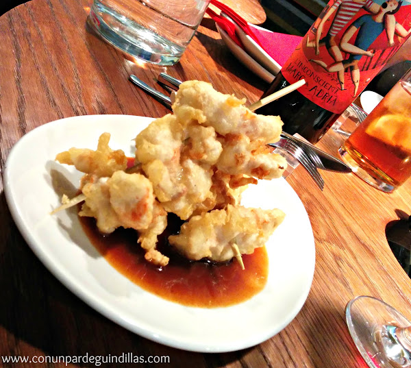 Yakitori es una brocheta típica de la cocina japonesa que tanto inspira a Alberto Chicote para intentar permanentemente esa especie de fusión japo-cañí y es lo que más abunda en la carta. Pequeñas elaboraciones atravesadas y cocinadas a la parrilla que se supone piden a gritos ser compartidas por todos los comensales en común. Y digo se supone porque a nosotros no nos inspiró eso en absoluto y cada uno pedimos dos y algún acompañamiento.