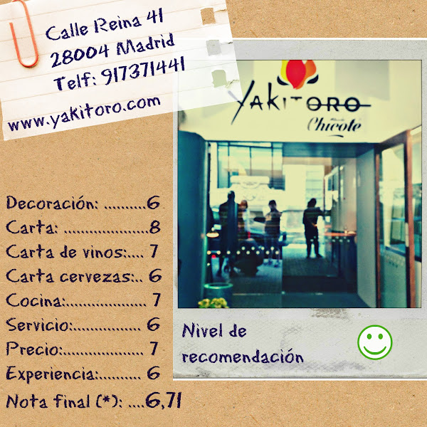 Yakitoro es diferente y no deja indiferente, o te gusta mucho o nada o, como es mi caso, algunas cosas te gustan mucho y otras nada. Es lo que tiene arriesgarse. El que no lo intenta no se estrella y, al menos de momento, el negocio parece ir muy bien (no hay más que ver la ocupación) y en ello influyen muchos factores.