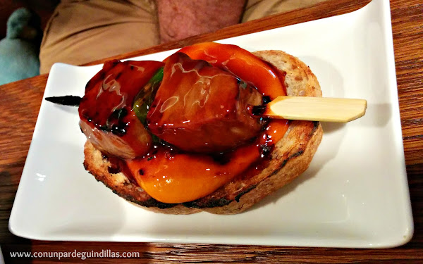 Atún rojo y pack choy, lacado, sobre pan y salmorejo