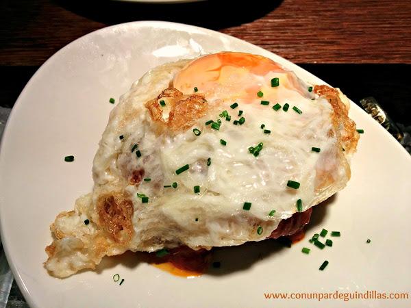 Pero no sólo de brochetas vive el hombre y hay otras opciones en la carta y mira por donde yo "piqué" en una al pedirme un "Huevo frito sobre disco de arroz tostado y salsa especiada de tomates", ósea, lo que viene siendo un arroz a la cubana de toda la vida con el arroz apretado en un aro y poco más. Yo creía que estos juegos de engolamiento de los nombres de los platos para hacerlos pasar por otros habían, afortunadamente, pasado a mejor vida. Por favor, desde aquí pido que se cambie el nombre a algo más humilde tipo "Nuestra versión de un arroz a la cubana con el inevitable cebollino picado por encima".