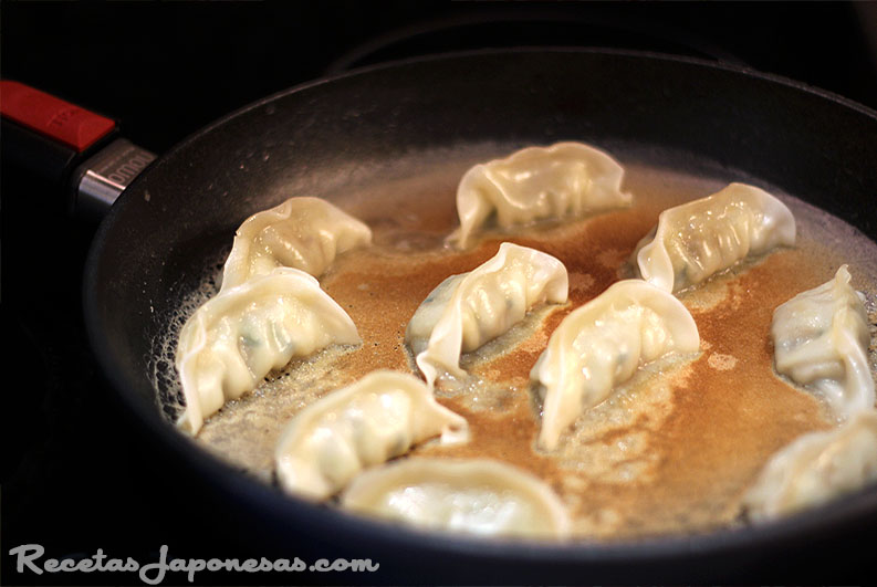 Si quieres que tus gyoza luzcan super crujientes con una base tostada, todo lo que has de hacer es mezclar harina en el agua de cocción, cuanto más harina añadas más crujientes quedarán ¡sin pasarse! suele ser una cucharada para que quede la base entera y sacarla de una sola vez con la espátula. Procura que tu sartén sea buena y con un potente antiadherente, sino te costará sacarla sin romperla. Esta sartén Titanium de Woll es ideal para ese fin. Todo los materiales que utilizamos los puedes encontrar en la web de Lecuine
