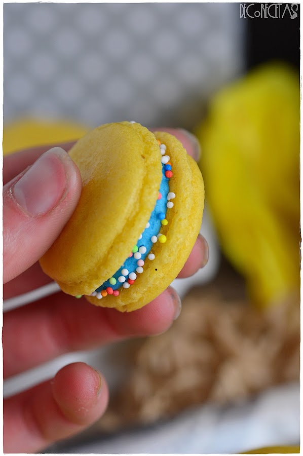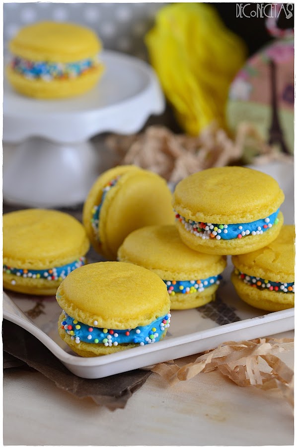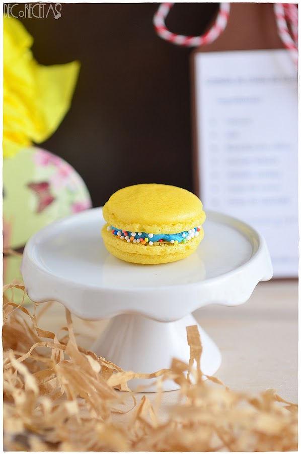 La receta de cómo los he realizado, la tenéis aquí, siempre realizo la misma ya que es la idónea para mí horno. Lo que cambia simplemente es el color y el relleno que en este caso es una simple buttercream realizada con mantequilla y azúcar glass con colorante azul. Como último toque unas bolitas de colores alrededor