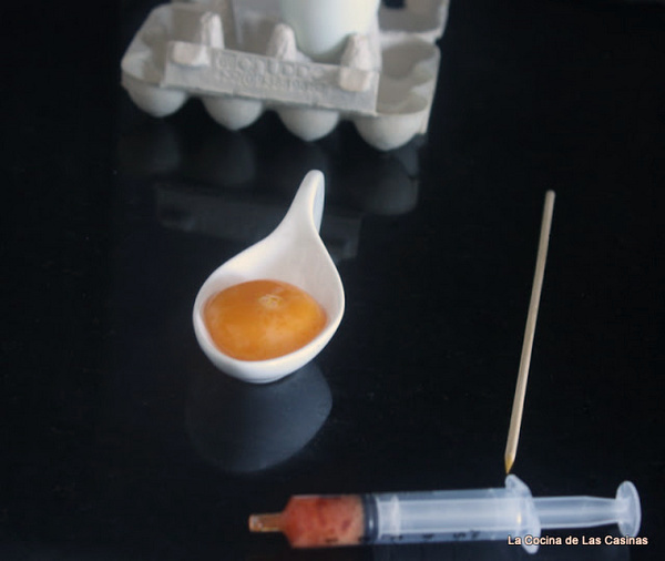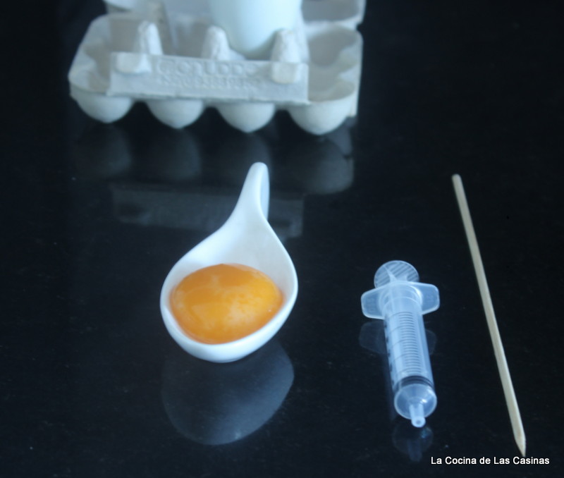 Prepara el instrumental, no te preocupes la operación es sencilla. Pincha en el centro de la parte superior con la brocheta, haciendo un agujerito sin alcanzar la parte de abajo. Succiona un 30-40% de la yema tirando hacia el exterior el émbolo de la jeringa. Desecha la yema, no la tires nos vale para pintar nuestros bollinos preñaos.