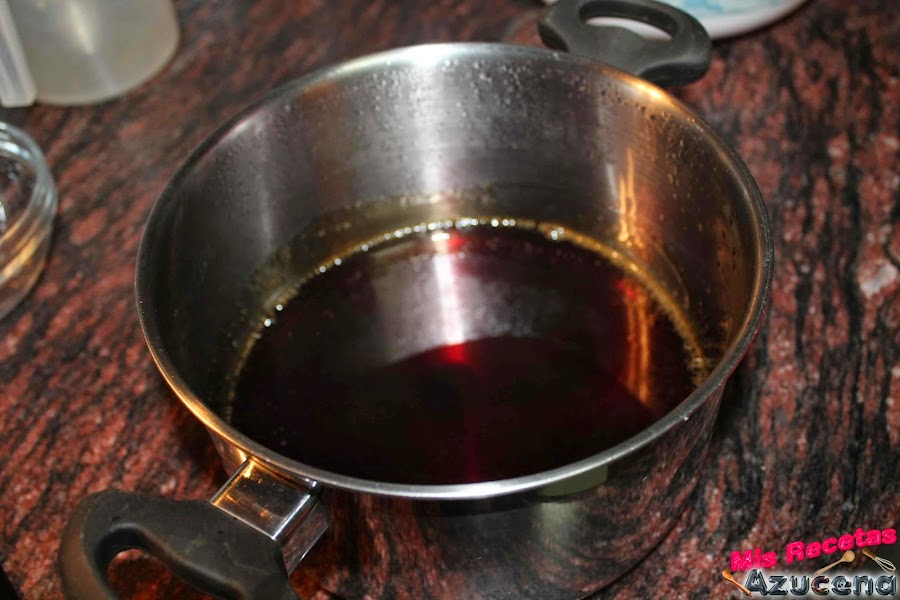 Ahora prepararemos el almíbar, en un cazo ponemos el agua y el azúcar, lo mezclaremos bien y lo herviremos entre 8 y 10 minutos, apartaremos y dejaremos que se entibie.