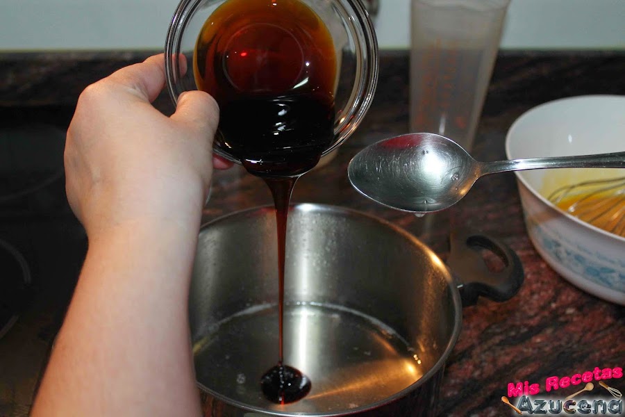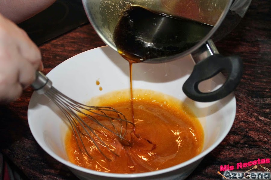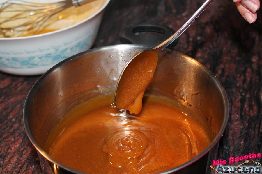 Una vez este a la temperatura que queremos le añadiremos el caramelo y con ayuda de unas varillas iremos removiendo hasta que es caramelo este bien disuelto.