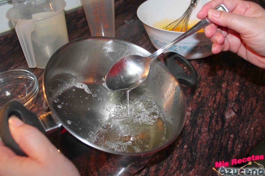 Cuando este todo el almíbar incorporado, pasaremos el contenido del bol a un cazo o una olla pequeña y la pondremos en el fuego, a fuego medio, sin dejar de remover con las varillas.