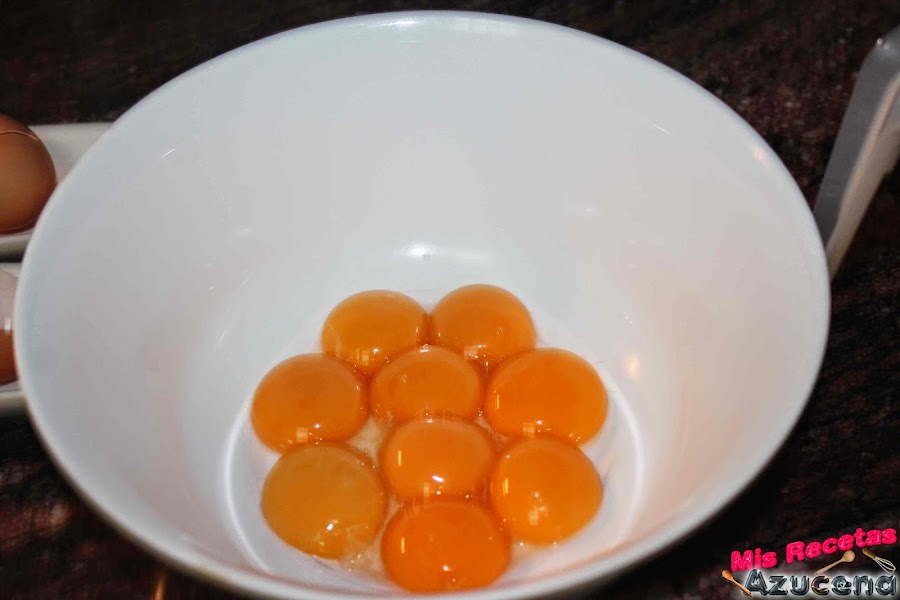Para la yema tostada solo necesitamos las yemas de los nueve huevos, en un bol cascaremos los huevos y pondremos las yemas y las claras las reservaremos en la nevera para hacer otro postre.