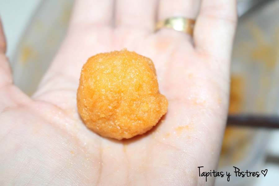 Hacemos bolitas pequeñas y rebozamos en la mezcla de azucar y canela. Ponemos en capsulitas pequeñas y dejamos reposar hasta que enfríen.