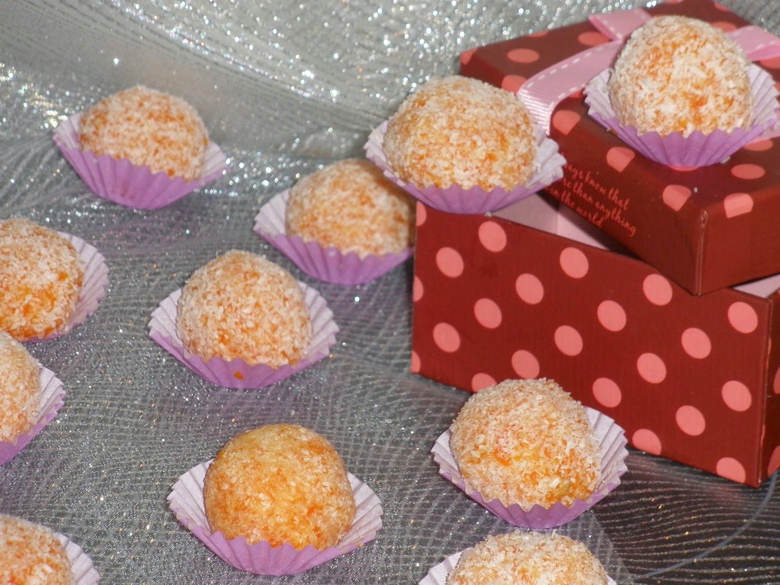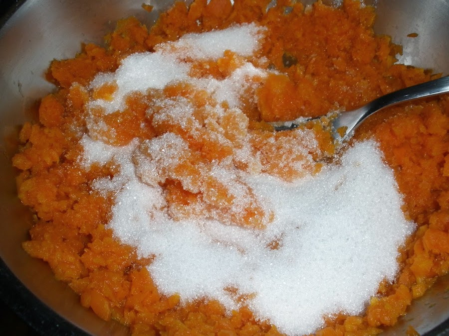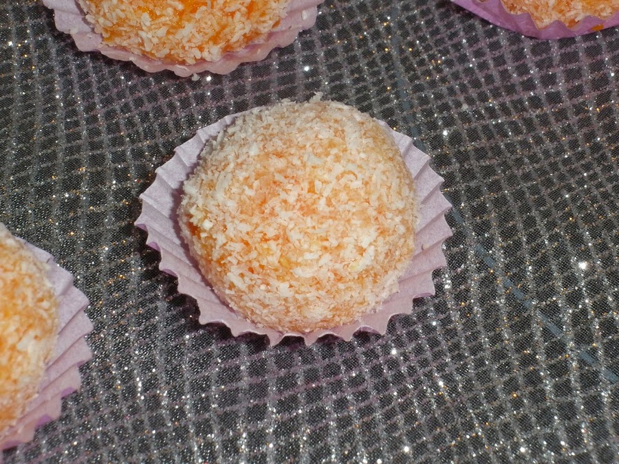 Añade el azúcar y las dos yemas de huevo al puré de zanahorias, y ve añadiendo cucharadas de coco rallado hasta que coja una consistencia media con la que después puedas trabajar con las manos. Yo necesité 10 cucharadas grandes de coco rallado para estas cantidades.