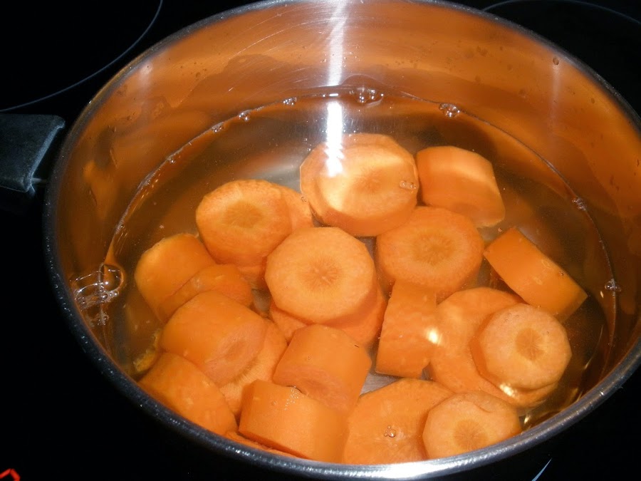 Pela y parte las zanahorias en trocitos para que se cuezan más fácilmente. Cuece las zanahorias en agua sin ningún aditivo durante unos 15 minutos.