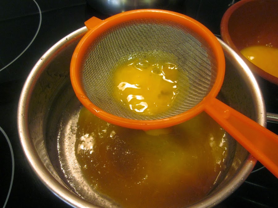Retiramos el cazo del fuego y añadimos las yemas ligeramente batidas, yo las he colado.