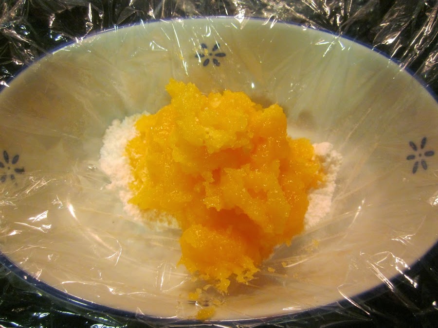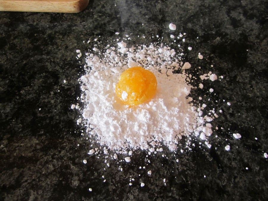 Dejamos enfriar totalmente las yemas , yo las puse en un bol forrado con film y con azúcar glass.