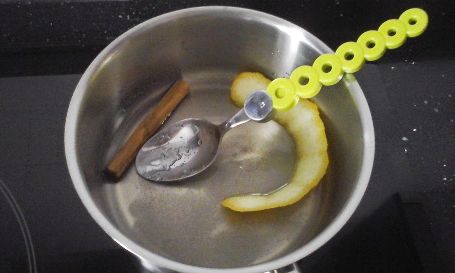 Poner en un cazo las tres cucharadas de agua, el azúcar, la corteza de limón y la canela. Calentarlo y dejarlo hervir a fuego bajo, removiendo. Cuando el almíbar espese, retira del fuego. Quitar la canela y el limón.