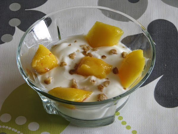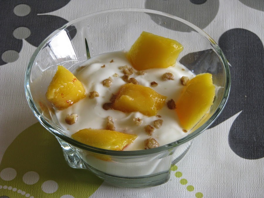 - Parte las nueces en trozos pequeños y espolvoréalo sobre el yogur con melocotón.