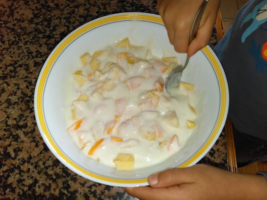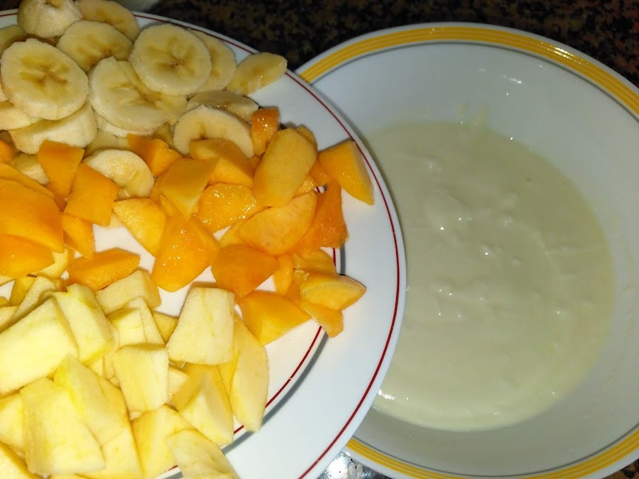 Se pela y corta la fruta y se añade a los yogures que habremos echado en una fuente