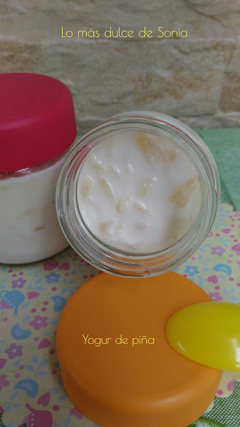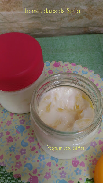 Troceamos dos rodajas grandes de piña en su jugo, a trocitos muy pequeños. Ponemos un montoncito de piña en cada tarro de yogur.