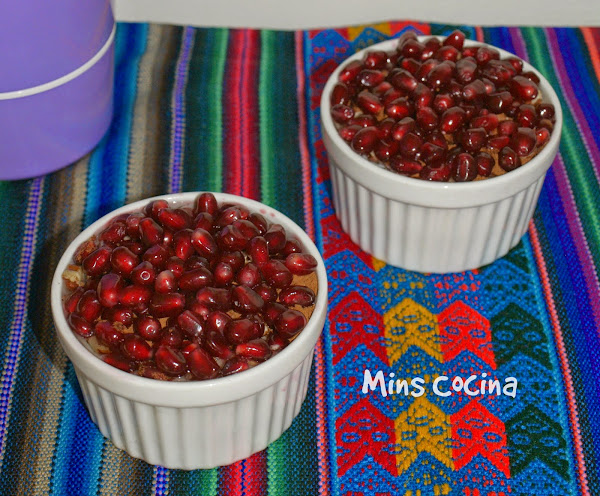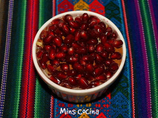 - Rociamos con el sirope, espolvoreamos canela al gusto y ponemos los granos de granada. Servimos inmediatamente o refrigeramos hasta la hora de comerlos.