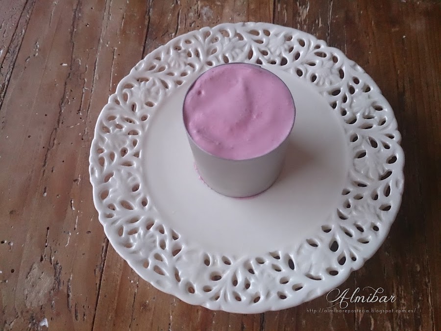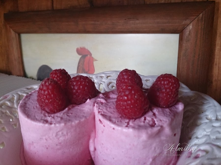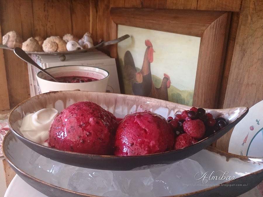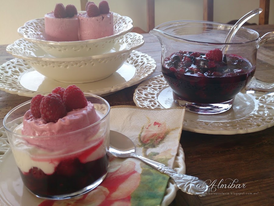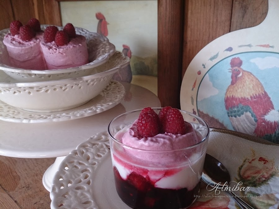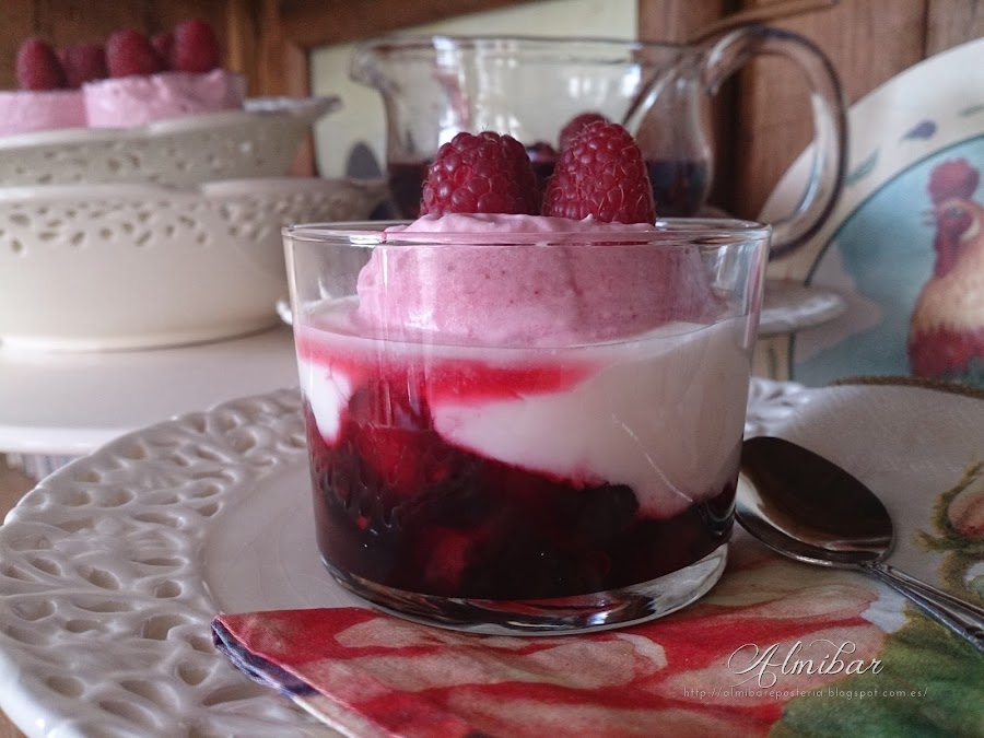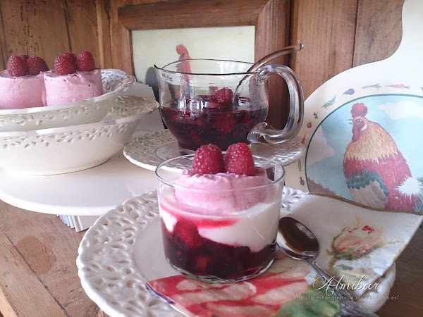 ...con frutas del bosque en almíbar, yogur griego y por encima el yogur helado con unas frambuesas llenas de sabor...