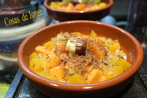 Decoramos rallando chocolate sobre las frutas.