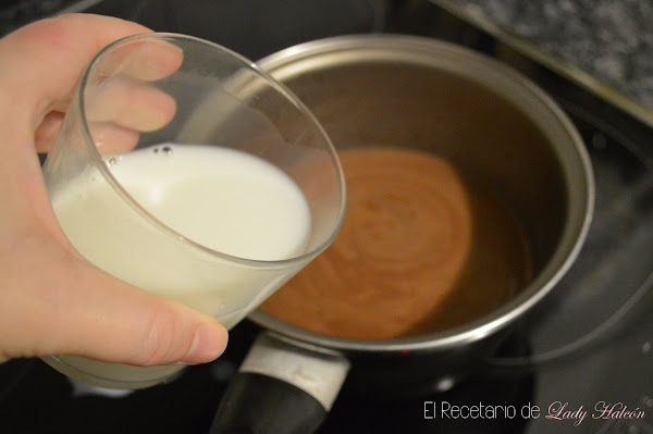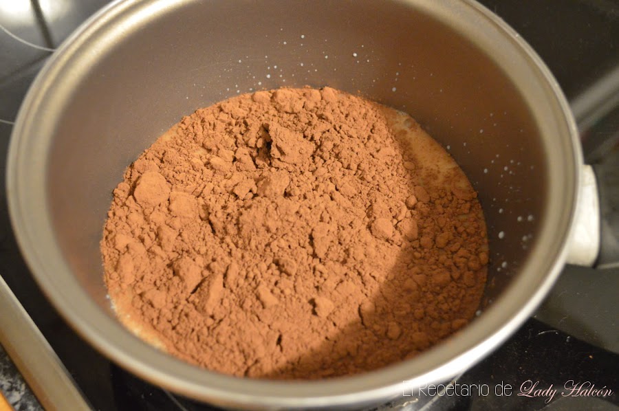 En un cazo a fuego medio-fuerte vierte el resto de la leche con el cacao y el azúcar y, cuando comience a hervir, retira del fuego.