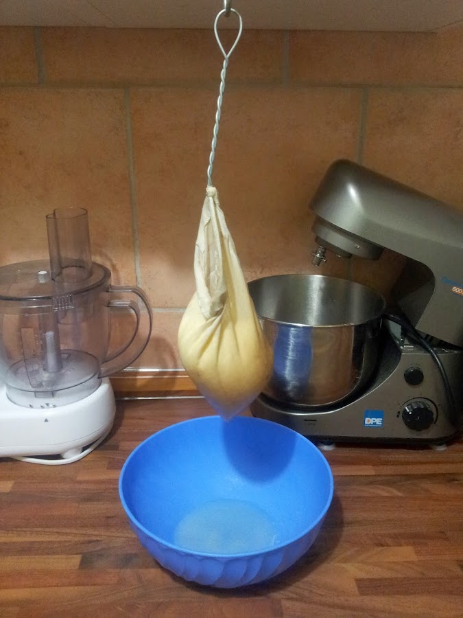 Versar todo el contenido del yogurt en el manto y cerrarlo a modo de paquete dejando en su interior el liquido.