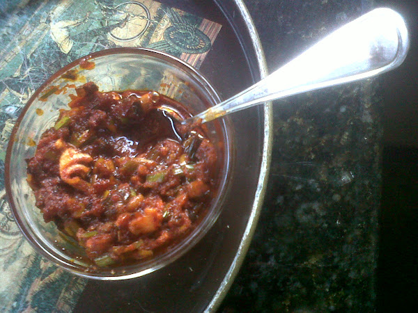 5 cebollitas de verdeo saltadas en una laguna de aceite de oliva o de maíz, revolver en ello 2 cucharadas de ají molido y 4 cucharadas de pimentón dulce.