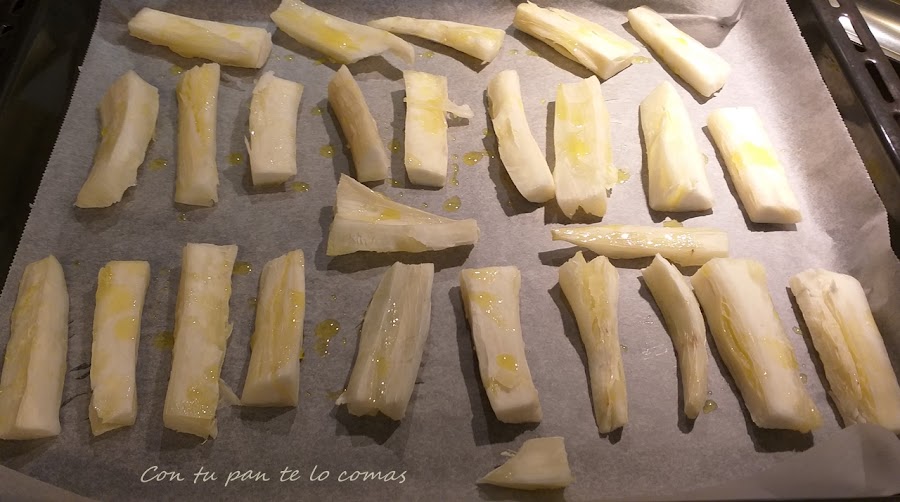 5. Después pondremos los bastones bien extendidos en una bandeja del horno con papel vegetal. Ahora puedes sazonar como prefieras, sal y pimienta, hierbas provenzales, ajo y perejil... o nada, y simplemente añadimos un hilito de aceite virgen extra por encima.
