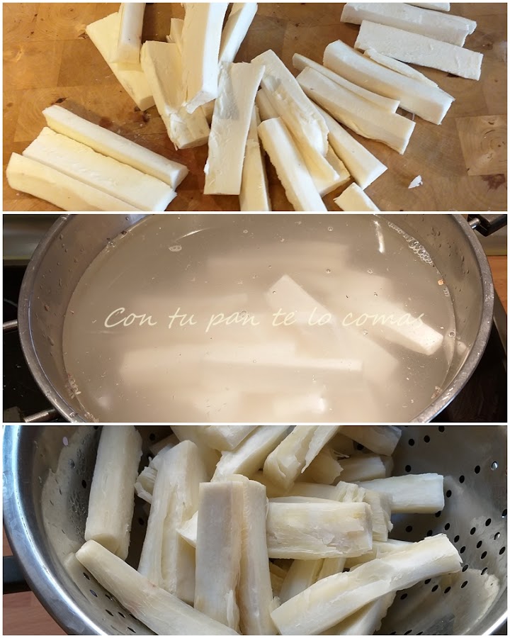No pongo cantidades, dependerá de cuánto queráis hacer y del tamaño de la yuca. Esta yuca era mediana y es suficiente para 3 personas.