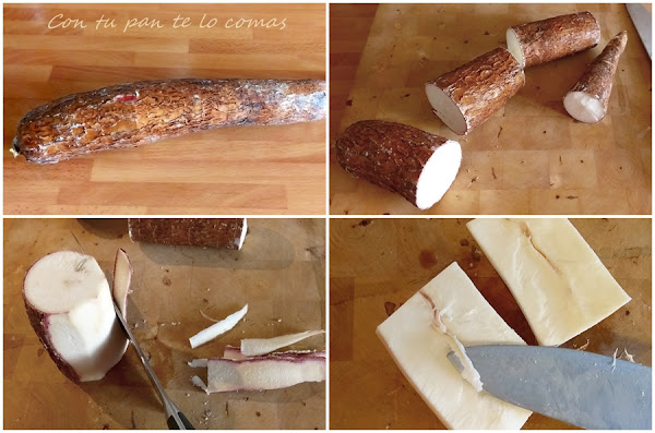 1. Procedemos a trocear la yuca. Tiene una corteza, cáscara o piel de color marrón que es bastante dura, por lo que tendremos cuidado con el cuchillo. A mi me va bien poner los trozos de pie sobre la tabla y cortar las dos capas a la vez con el cuchillo, en vertical. Hay que quitar la corteza marrón y la parte morada.
