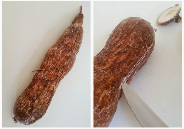Primero si tiene tierra se lava, si viene cubierta de cera no sera necesario este paso, Pelamos la yuca de la siguiente manera, primero,quitamos los extremos, trazamos con el cuchillo una linea de arriba a abajo de la piel o cascara enterrando el cuchillo menos de medio centímetro, luego por el corte que hemos hecho, metemos la punta del cuchillo en diagonal, como un centímetro de profundidad y levantamos este en diagonal, haciendo palanca para desprender la piel, continuamos así girando la yuca y levantando la piel hasta quitarla toda, entre mas fresca este, la piel se desprenderá con mas facilidad.